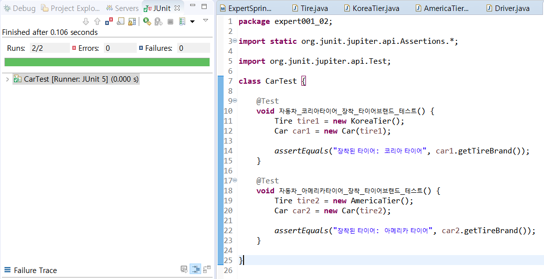 assertEquals("장착된 타이어: 아메리카 타이어", car2.getTireBrand());