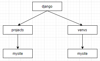 django라는 폴더에 venvs와 projects라는 폴더가 존재하고, 각각 mysite라는 폴더를 하위구조로 같는 상태이다.