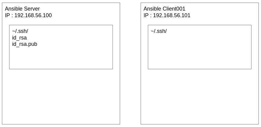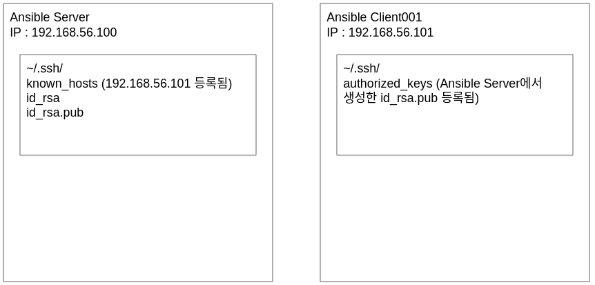 Ansible Server가 Ansible Client001에 접속해서 작업을 해야하는 상황을 가정한다. 즉, Ansible Server에서 패스워드 입력 없이 Ansible Client001에 접속이 가능해야 한다.