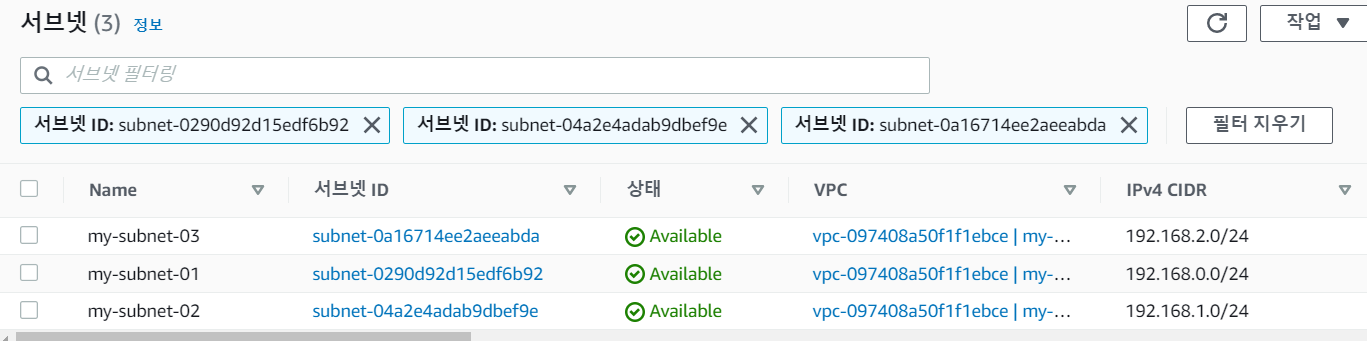 두 개의 서브넷을 더 추가. 각각 192.168.1.x, 192.168.2.x 범위를 사용하도록 지정. (총 3개의 서브넷 생성)
