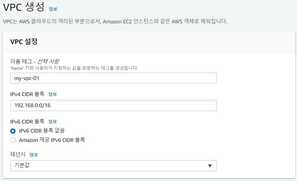 VPC 이름, IPv4 CIDR 블록 설정. 사설망 대역으로 192.168.x.x/16으로 설정