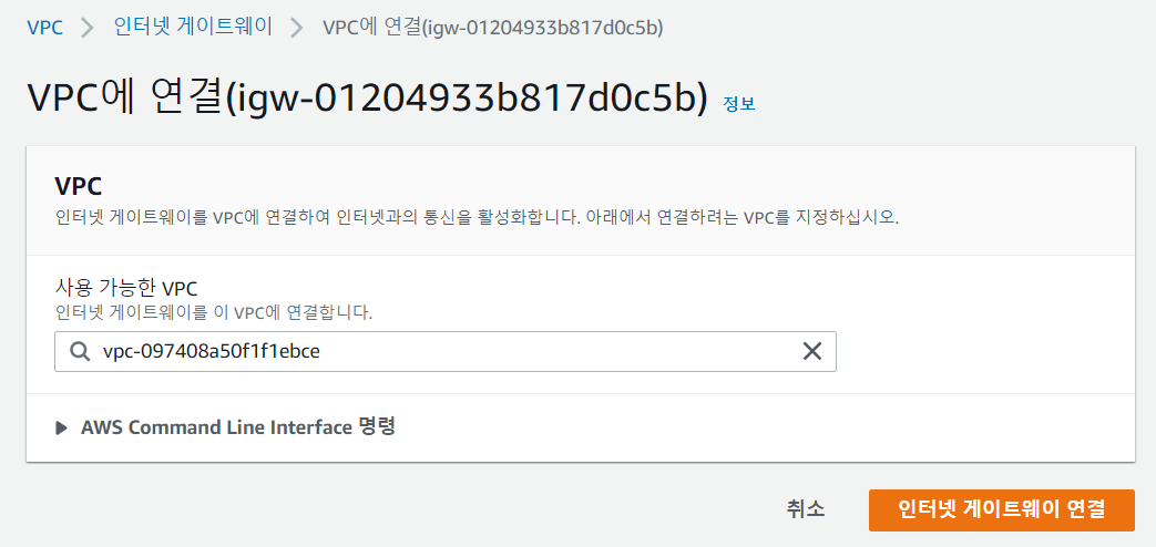 위에서 생성한 vpc를 선택한 뒤 연결하면 된다.