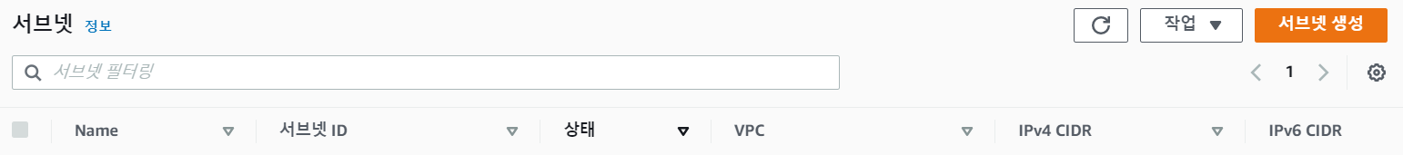 서브넷 탭으로 이동한 뒤, 서브넷 생성 클릭