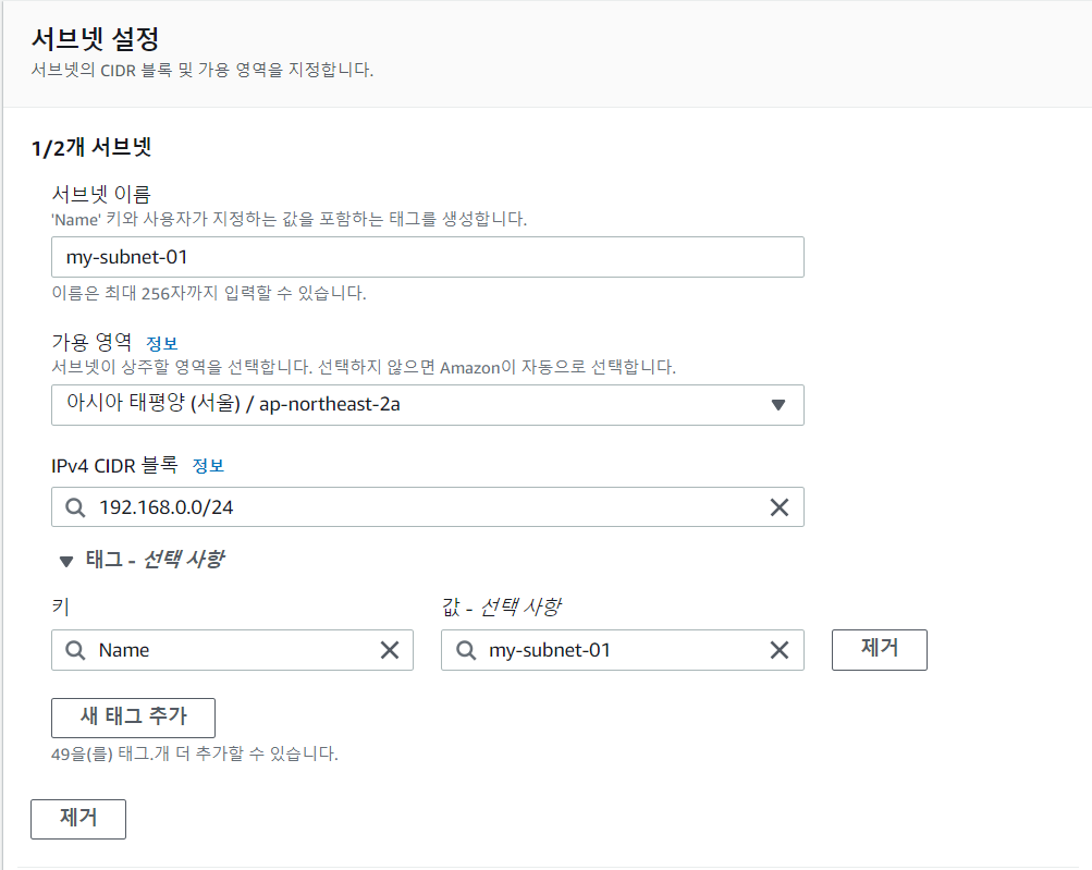 첫번째 서브넷은 2a 가용 영역에 생성. IP는 범위는 192.168.0.0 ~ 192.168.0.255